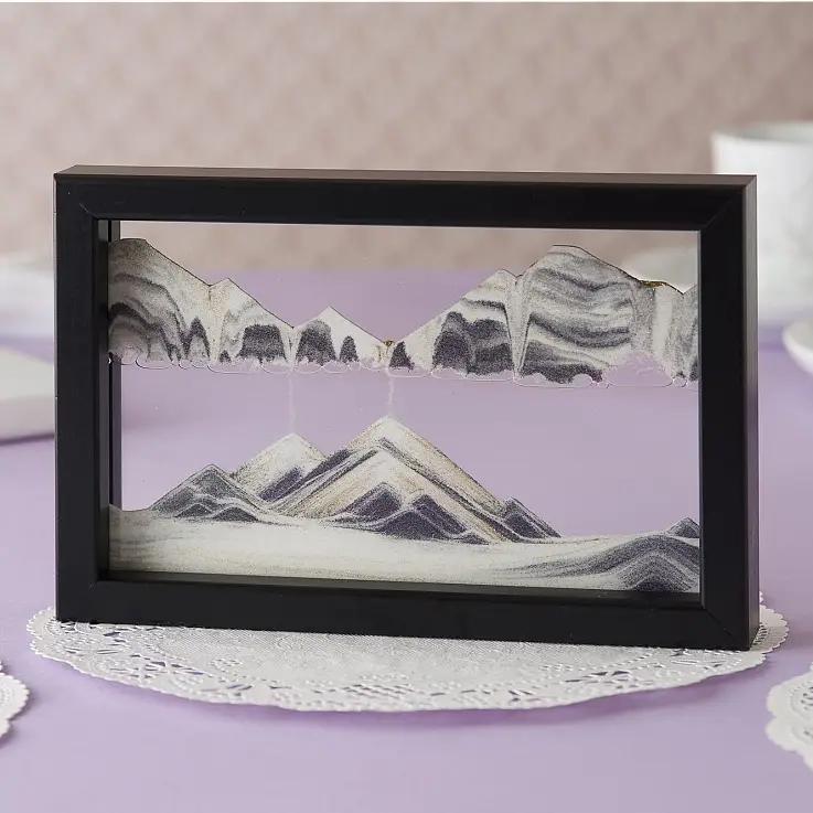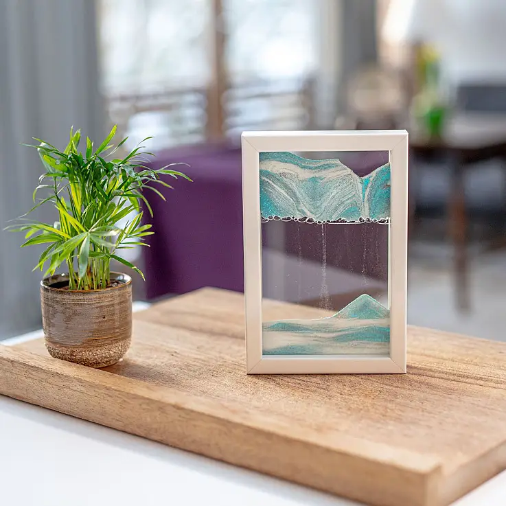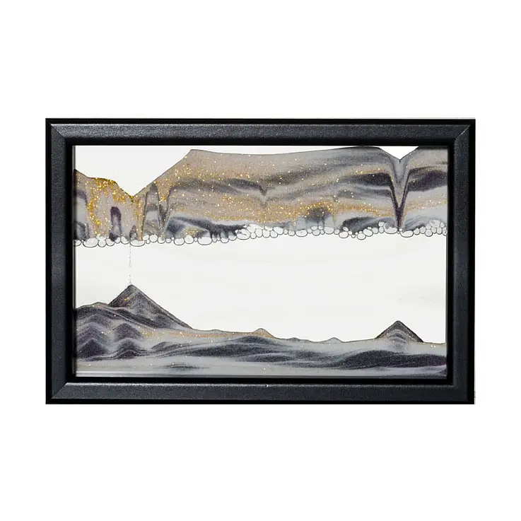 Du kannst dir aussuchen, ob du es horizontal oder vertikal aufstellen möchtest, da es so konzipiert ist, dass sich der Sand in jeder Position bewegt. Das bewegliche Sandbild „Horizon“ ist mit Rahmen in zwei Farben erhältlich: Schwarz und Weiß, damit du den Stil wählen kannst, der dir am besten gefällt.
