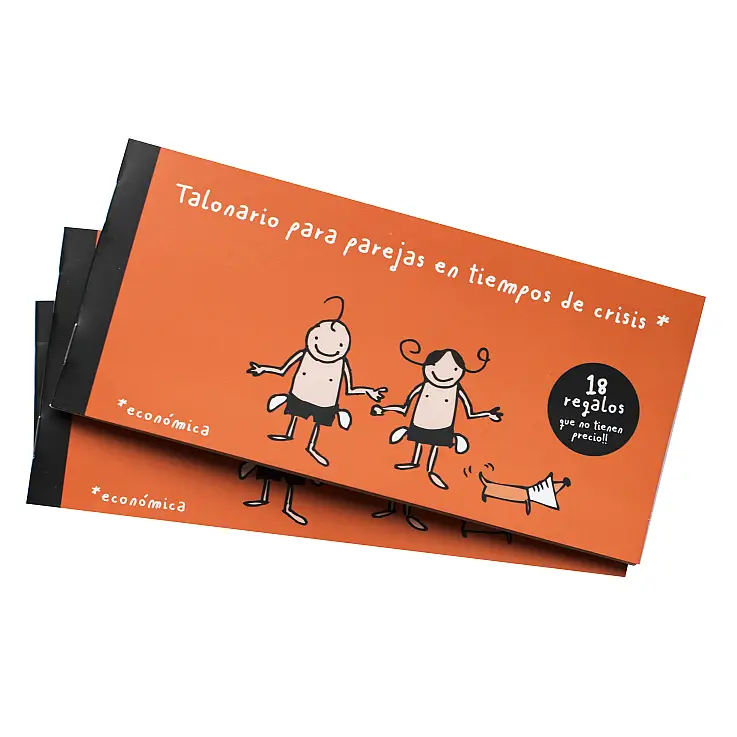 Das Talonario para Parejas en Tiempos de Crisis interpretiert auf originelle Weise eine neue Art des Schenkens von immateriellen und unbezahlbaren Geschenken. Durch die amüsanten Illustrationen von Irene Miranda enthält dieses Scheckbuch 18 Schecks, die ein romantisches Abendessen wert sind, einen Grund geben oder eine sexuelle Fantasie erfüllen, neben vielen anderen appetitlichen Dingen. Einer der Schecks ist leer, so dass das beschenkte Mitglied des Paares ausmalen kann, was immer es möchte, es liegt also an ihm, um etwas zu bitten...