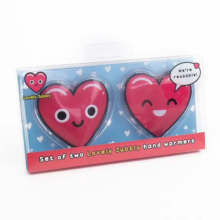 - Die herzförmigen Handwärmer sind in einer transparenten Kunststoffbox verpackt.