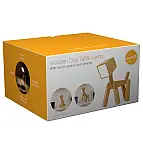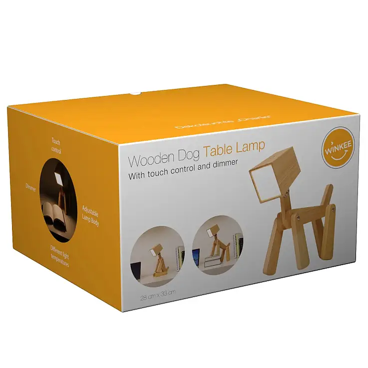 - Die Holzlampe in Form eines Hundes ist in einer illustrierten Pappschachtel verpackt.