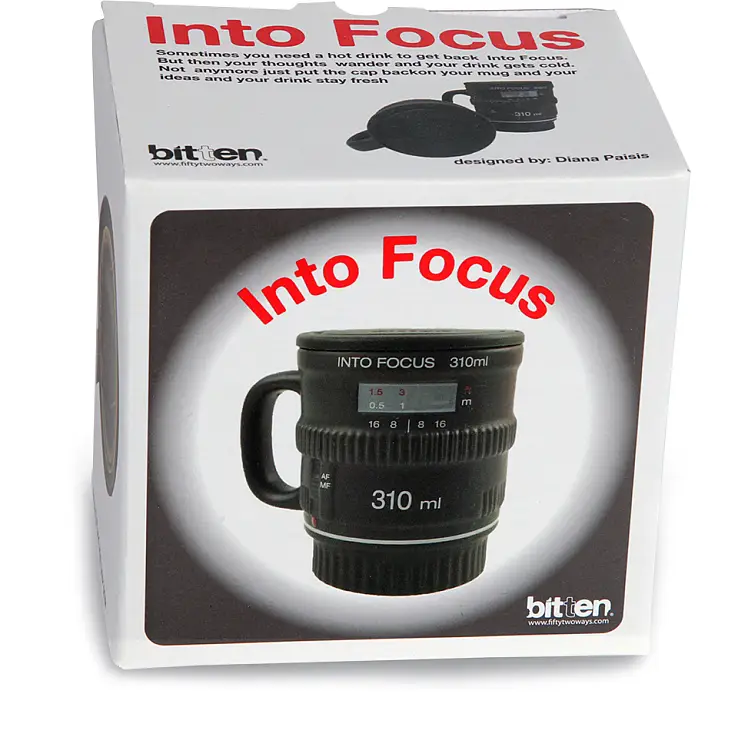 Die Tasse Into Focus ist eine Keramiktasse, mehr im Pop-Stil als die klassische Linsen-Tasse, mit einem Silikongriff und -deckel, so dass sie länger warm bleibt, wenn du einen Kaffee oder Tee trinkst, um dich ein wenig auf deine Hausaufgaben oder dein Studium zu konzentrieren.