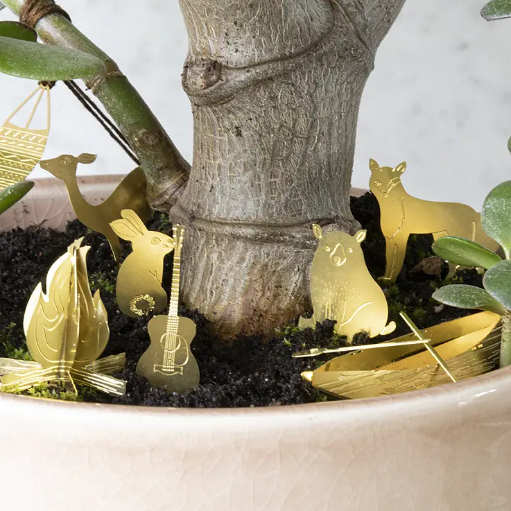 Verleihen Sie Ihren Pflanzen ein originelles und wertvolles Detail mit diesem Set aus Messingfiguren, das einen Campingausflug im Wald nachstellt. Ein Lagerfeuer, ein Zelt, ein Kanu? sogar ein Bär!