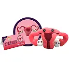 Es hat auf jeder Seite einen Eileiter und enthält zwei Mini-Eierstock-Stofftiere. Das Etikett auf dem Plüschtier erklärt die Funktionsweise der Gebärmutter, dem Organ, in das die Zygote eingepflanzt wird: die Zelle, die aus der Vereinigung einer Ei- und einer Samenzelle hervorgeht.