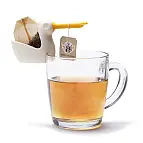 Er hat verschiedene Funktionen: Der Teebeutel hängt an seinem Schnabel, um ihn beim Aufbrühen zu halten. Zwischen seinen Flügeln befindet sich ein Fach, in das Sie den Tee beutel vor und nach dem Gebrauch legen können.