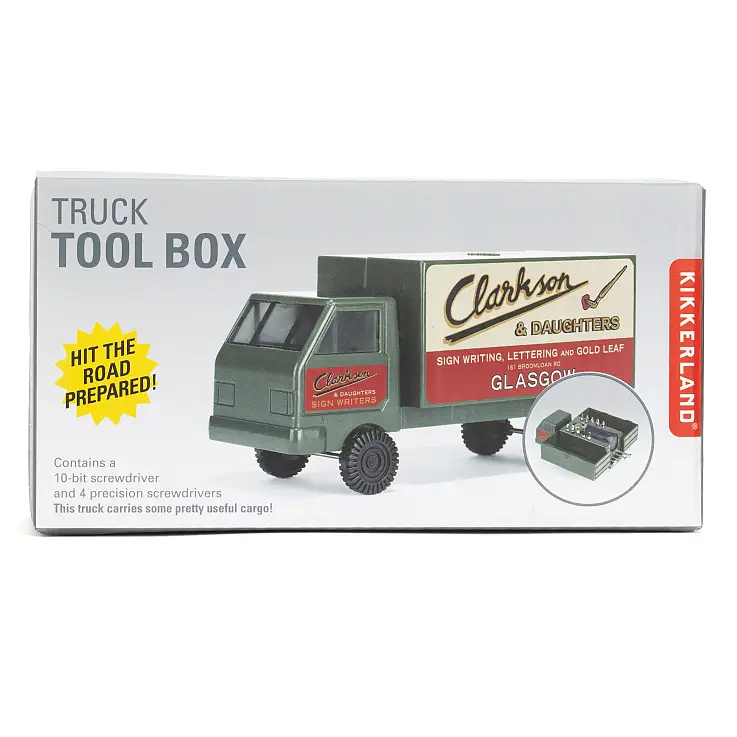 In einem kleinen LKW im Retro-Stil findest du einen Griff, zehn Schraubenzieherspitzen und sechs Präzisionsschraubenzieher.