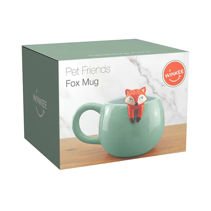• Die Tasse mit dem herausschauenden Fuchs ist in einer illustrierten Pappschachtel verpackt.