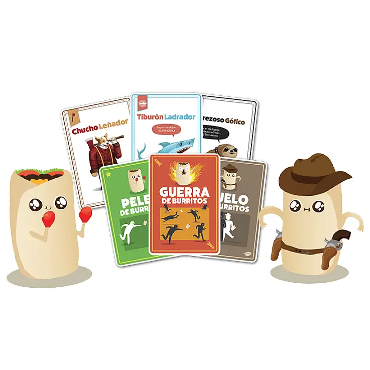 Als Partyspiel besteht die Dynamik des Spiels, bei dem es keine Spielzüge gibt, im Wesentlichen darin, Karten zu ziehen, Punkte zu sammeln, indem man Dreiergruppen von Karten bildet, und sich gegenseitig mit Dingen zu bewerfen, in diesem Fall mit zwei riesigen Burritos. Es gibt auch spezielle Karten, die Konsequenzen haben... Esel-Kampf, Esel-Krieg und Esel-Duell. Ziehe Karten vom Spieler zu deiner Linken oder vom mittleren Stapel, um zu versuchen, Trios aus passenden Karten zu bilden.